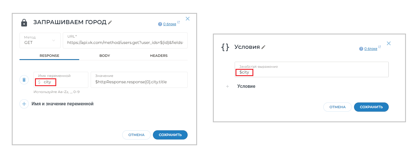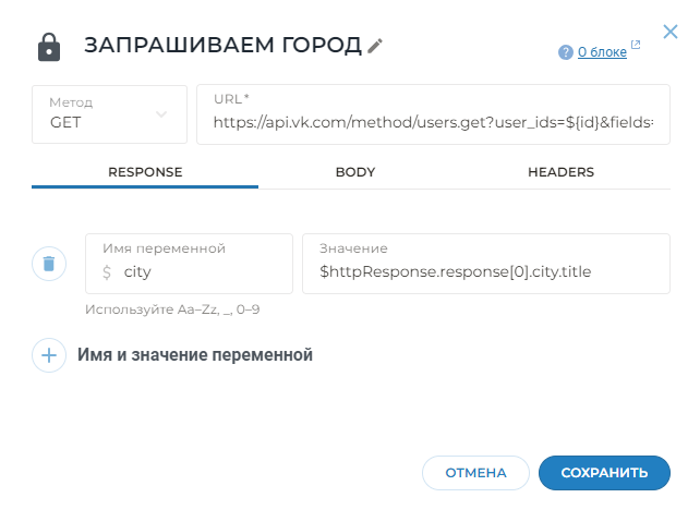 - От блока условий сделаем связь с HTTP-запросом, чтобы получить город пользователя из информации о странице ВКонтакте: