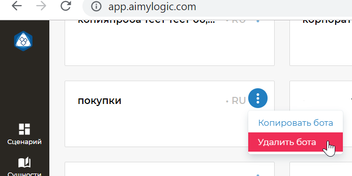 С помощью функции Копирование бота вы можете создать нового бота, сделав дубликат одного из ранее созданных ботов в вашем аккаунте Aimylogic.