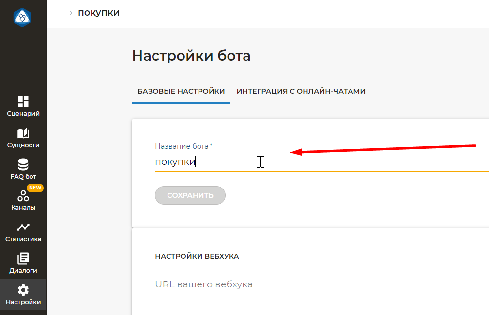 Изменить название сценария в поле Название бота: