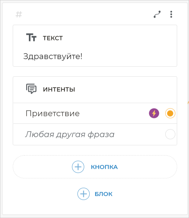 Интент — это блок в сценарии Aimylogic, с помощью которого бот понимает, чего хочет клиент.
