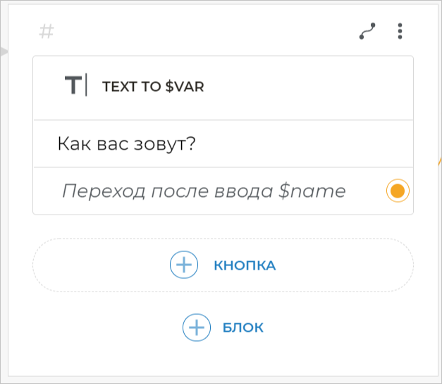 Для этого добавьте новый экран с блоком text to $var, который находится в подменю Еще блоки. С его помощью полученное от клиента имя сохранится в переменную, которую можно будет далее использовать в любом месте сценария.
