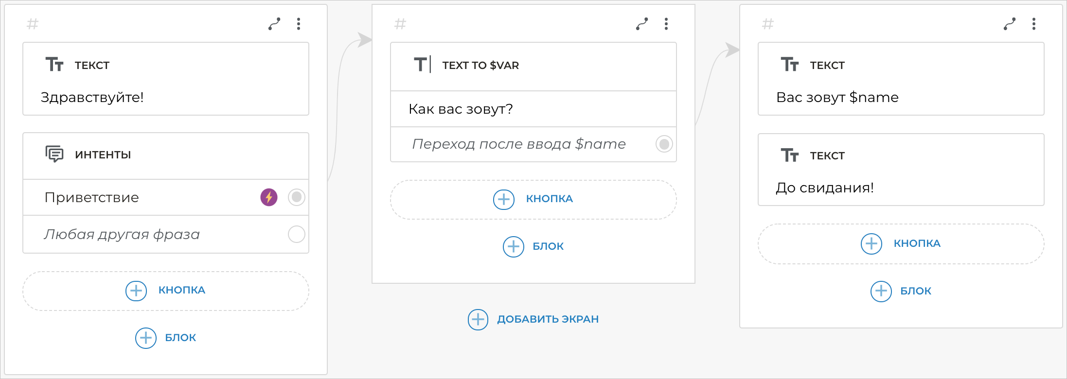 Блоки добавляются на экраны. Каждый экран — это состояние бота, в котором он совершает действие или ряд действий.