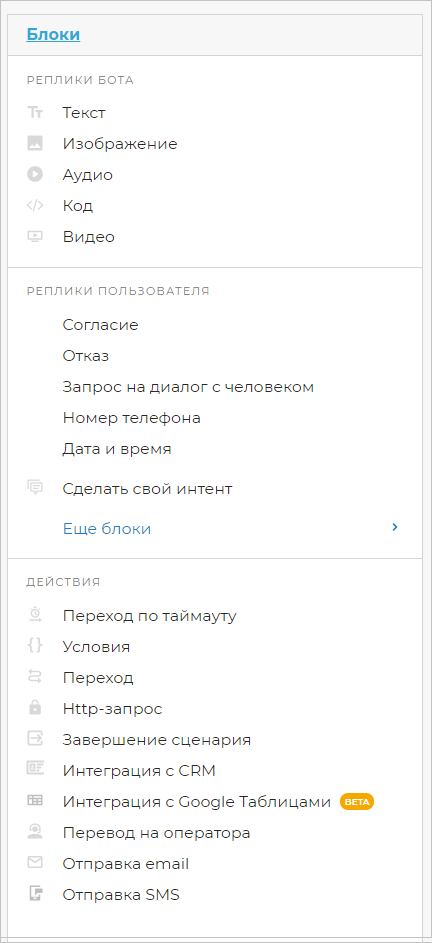 Блоки — это «кирпичики», из которых строится логика работы сценария. Каждый из блоков — это какое-либо действие, которое совершает бот: приветствие клиента, отправка изображения или распознавание того, что клиент хочет сделать заказ.