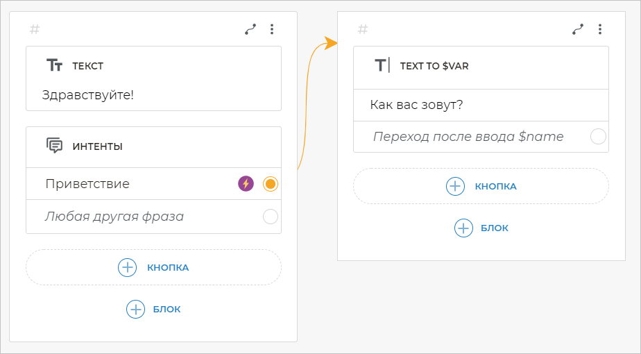 Теперь у вас в сценарии есть два экрана, но они пока не соединены между собой. Так как бот должен спросить имя клиента только после того, как клиент поздоровается, соедините интент Приветствие со вторым экраном, на котором бот задает клиенту вопрос.