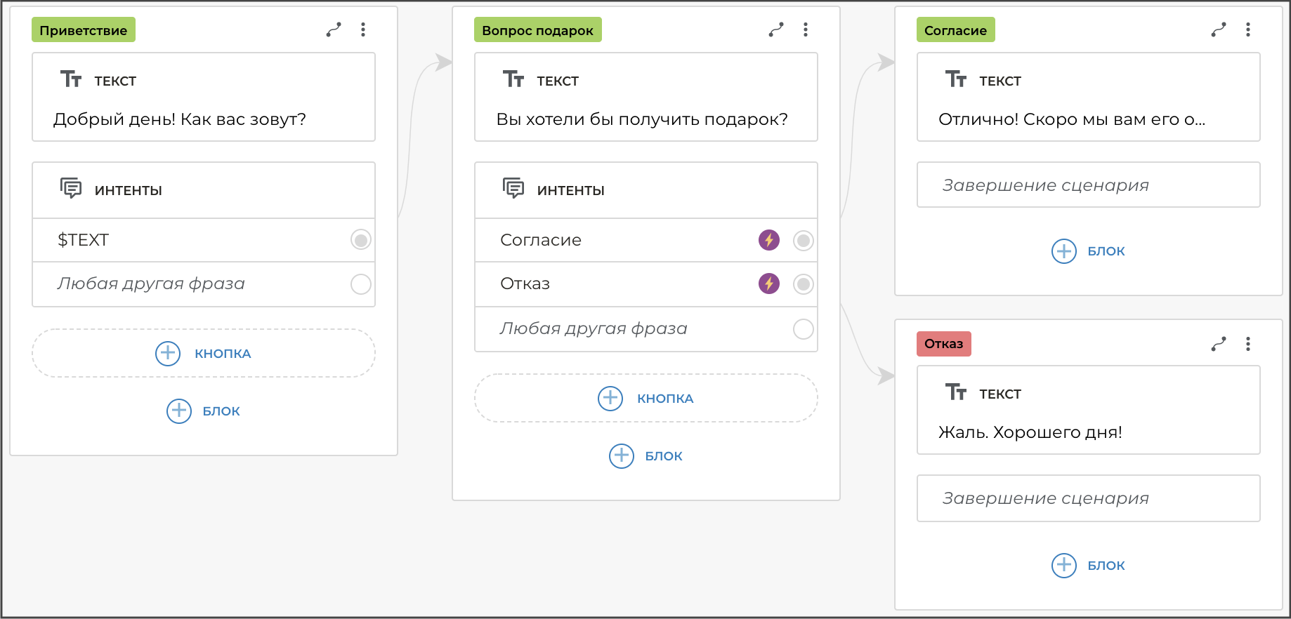 Например у вас есть кампания, в рамках которой боты предлагают вашим клиентам подарок за использование сервиса. Для экрана с вопросом о том, хочет ли клиент получить подарок, вы указали метку Вопрос подарок: