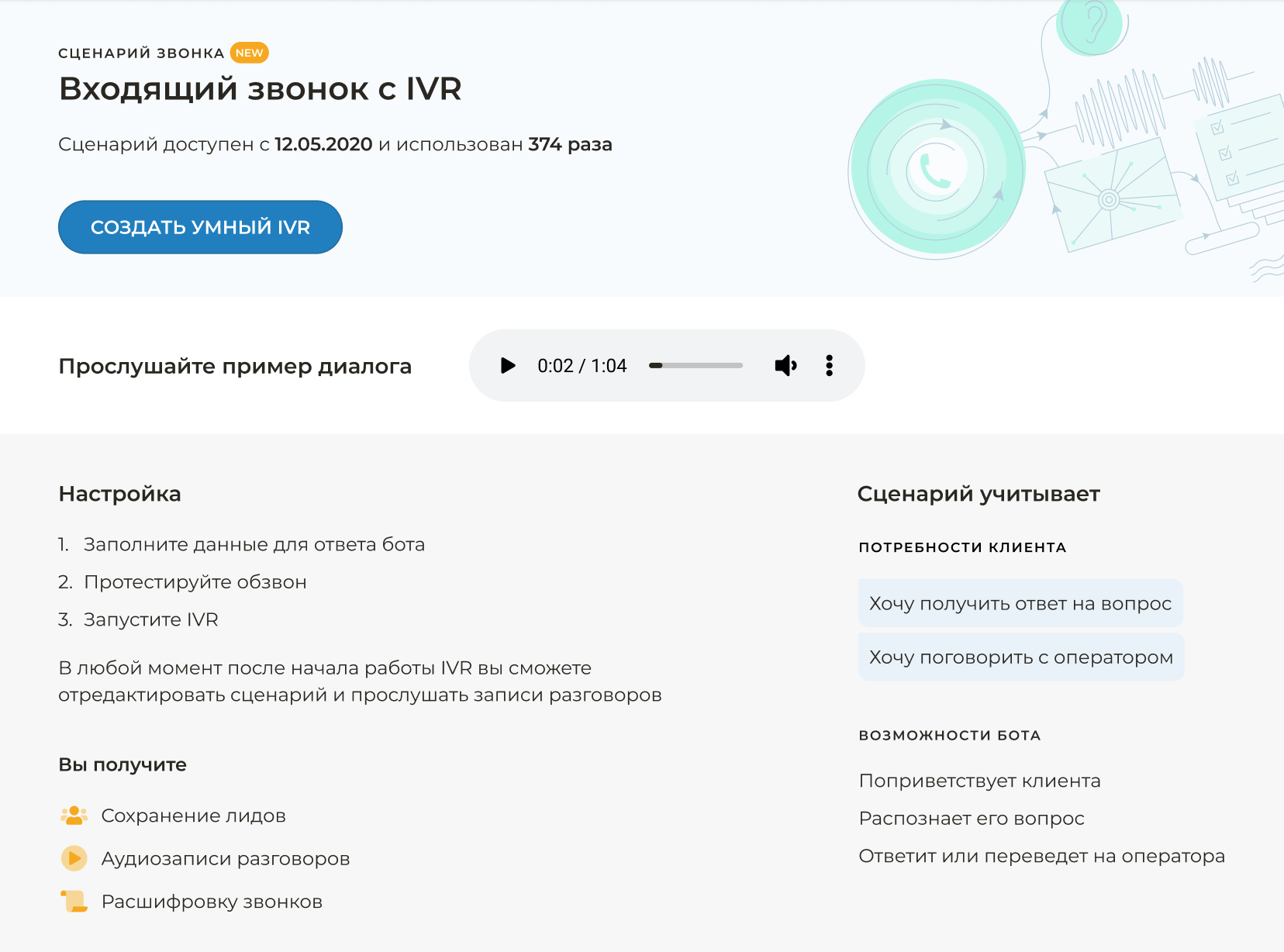 Перед началом заполнения информации вы сможете прослушать пример диалога и узнать, что нужно сделать для подготовки обзвона.