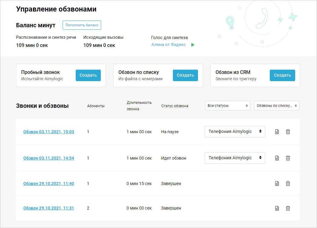 Убедитесь, что у вас положительный баланс минут, иначе обзвон не начнется: