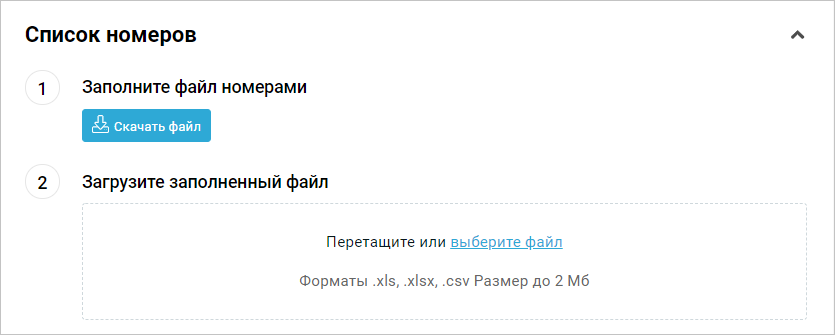 В секции Список номеров нажмите Скачать файл, чтобы скачать шаблон таблицы с номерами.