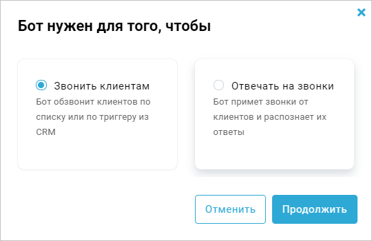 Выберите вкладку Звонки → Создать бота → Звонить клиентам → Продолжить: