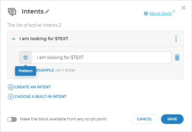 For example, you have a template like I am looking for $TEXT. When the client writes “I am looking for an interesting job”, the bot will get “an interesting job” from a phrase and save it to the $TEXT variable.