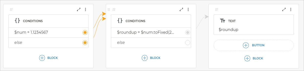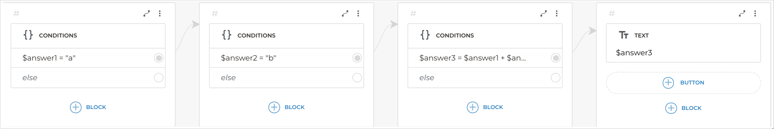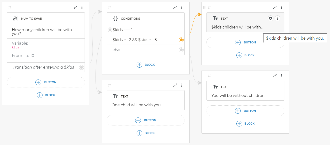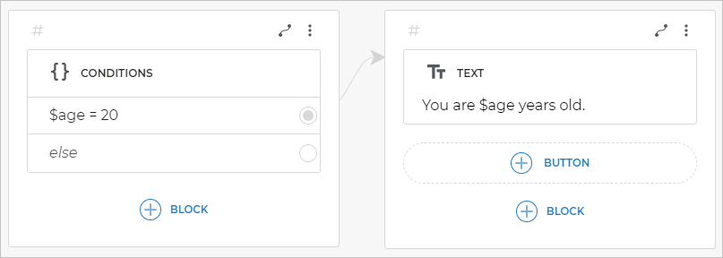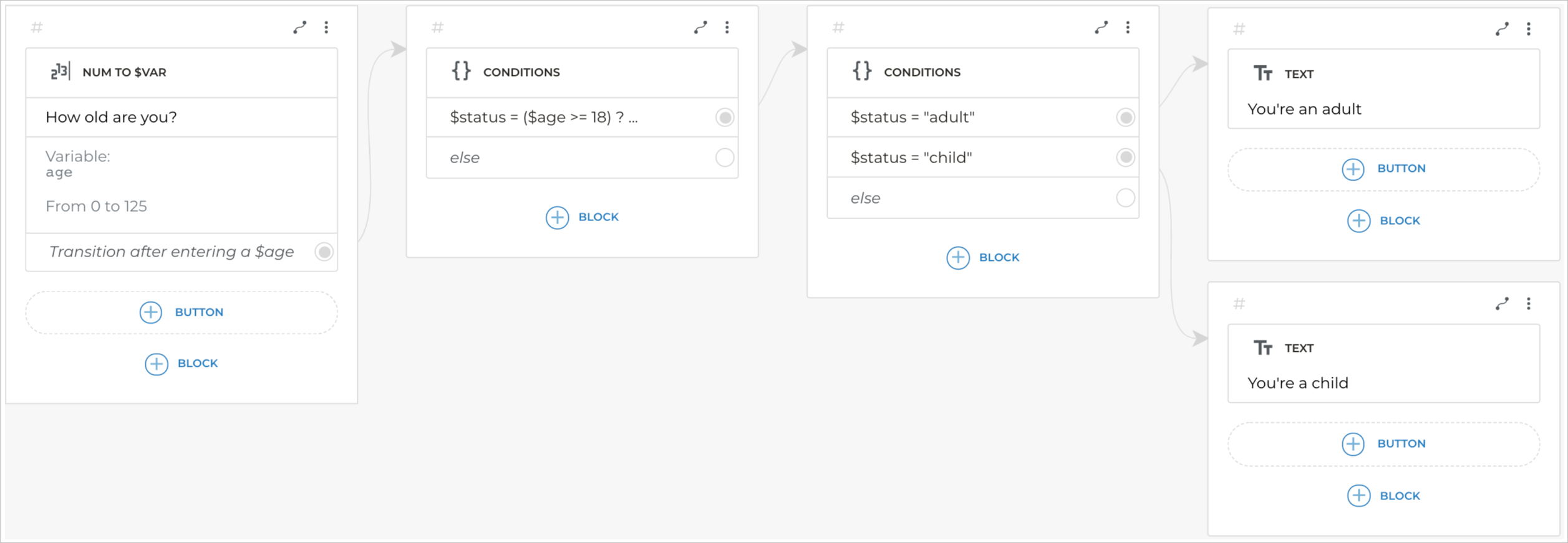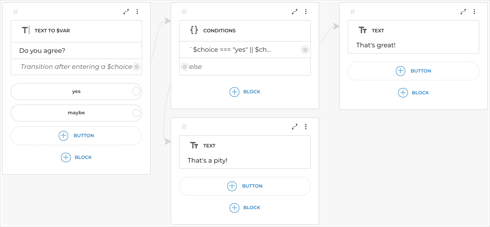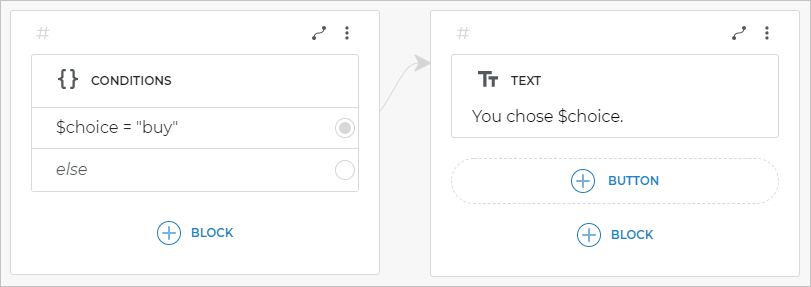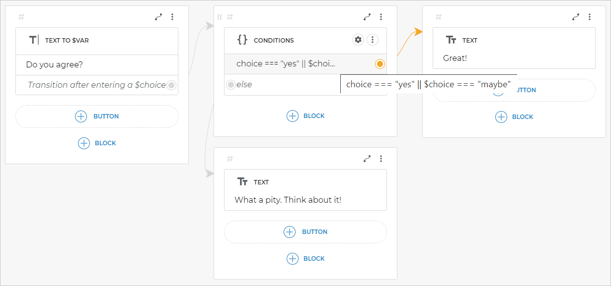 The Conditions block directs your bot to a certain screen depending on the condition fulfilled.