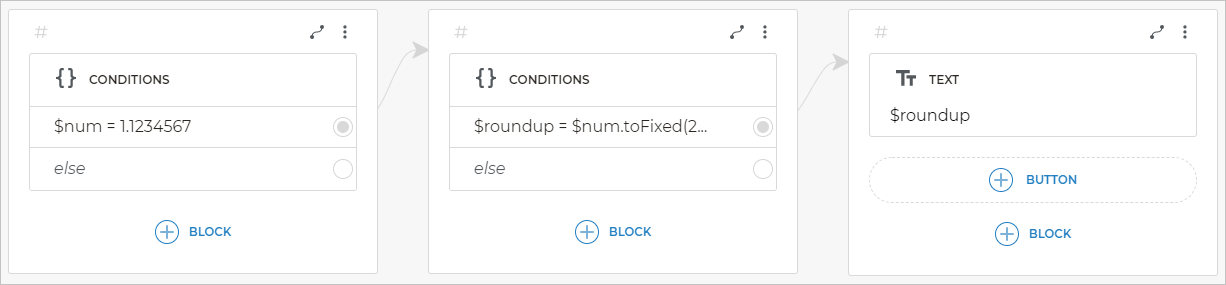 As the result of condition execution, the bot will put the sum of $num1 and $num2 variables into the $num3 variable, and also put the difference of these variables into the $num4 variable.
