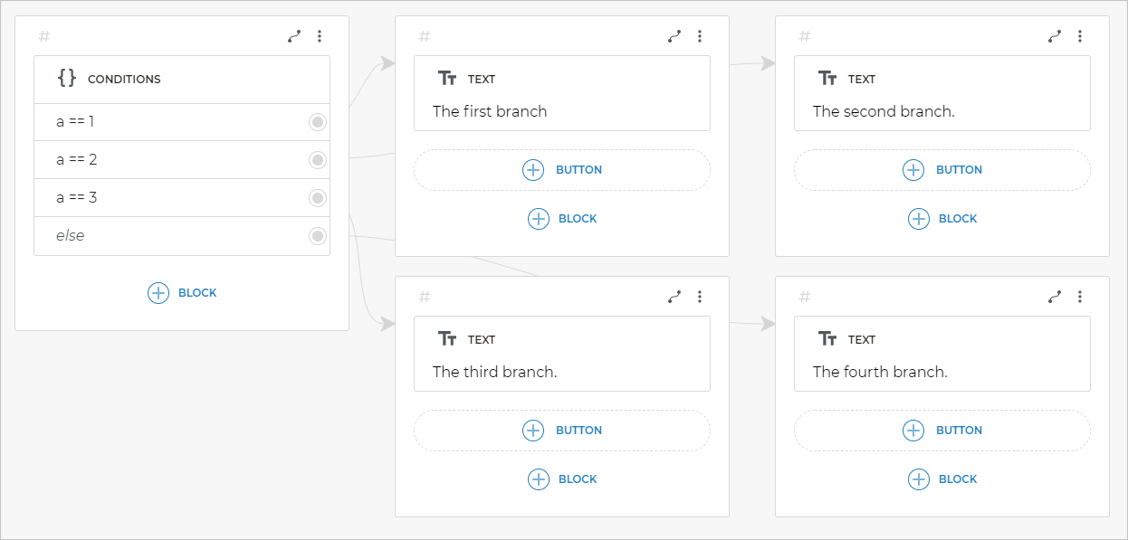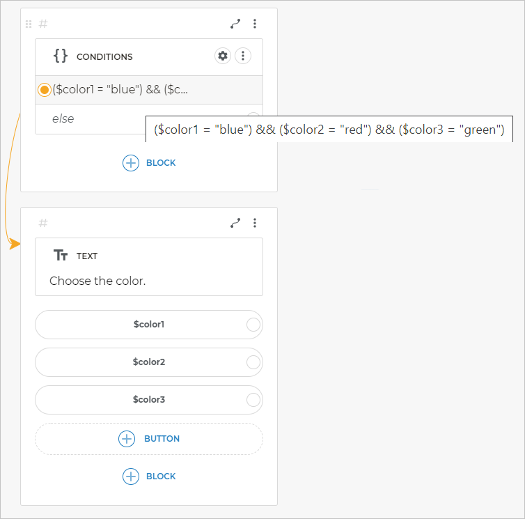 Each condition has a separate exit from the block which can be connected to different screens. Therefore, if each expression in the Conditions block is connected to the separate screen, the number of branches from the block will be equal to the number of the conditions, plus the else condition.
