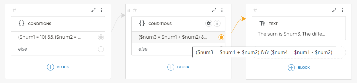 You can perform arithmetic operations in your Conditions block. In JavaScript, you can sum not only numbers but strings (text) as well. For example, ab will be output here in the result of string variables addition: