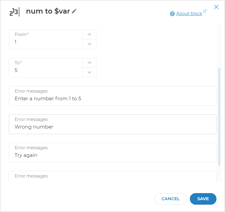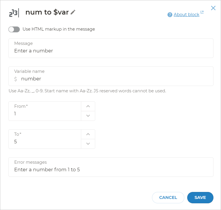The num to $var block expects the client to enter a number (including its text representation). The block will understand “5”, “five” or even options like “I believe it’s 5”.