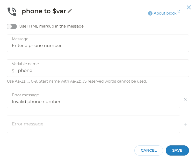 The phone number will be saved into the $phone variable. Also, you can name the variable as you want when adding a block.
