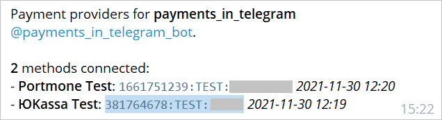 - Open the dialog with BotFather again. In the last message from BotFather, you will see the list of connected payment methods. Copy the token for your payment provider:
