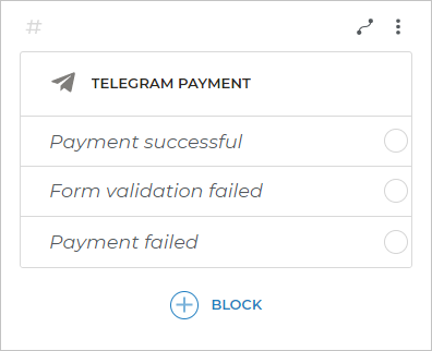 The Telegram payment block allows receiving payments from Telegram users via the built-in Telegram Bot Payments service. This service is integrated with various payment providers.