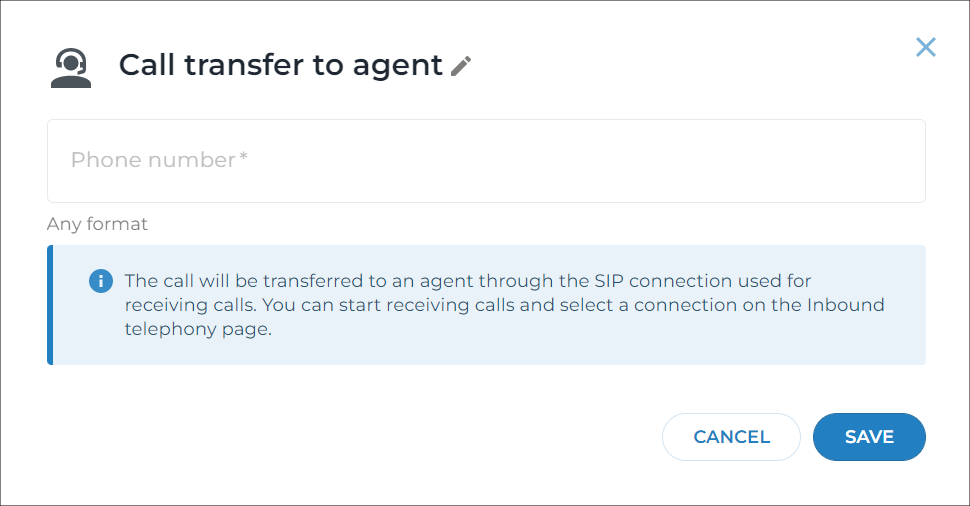 If you use your own SIP connection, billing is suspended when the call is transferred to the agent. Billing will resume as soon as the dialog returns to the bot.