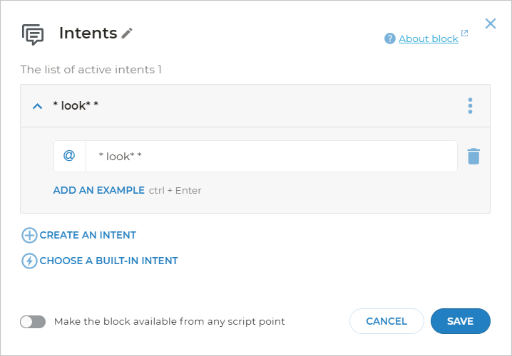 This template will make the bot recognize the phrases like “look”, “I am looking for a new iPhone”, “I have looked through your site”, etc.