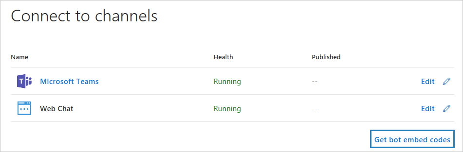 MS Teams will be displayed in the channel list. Click Get bot embed code: