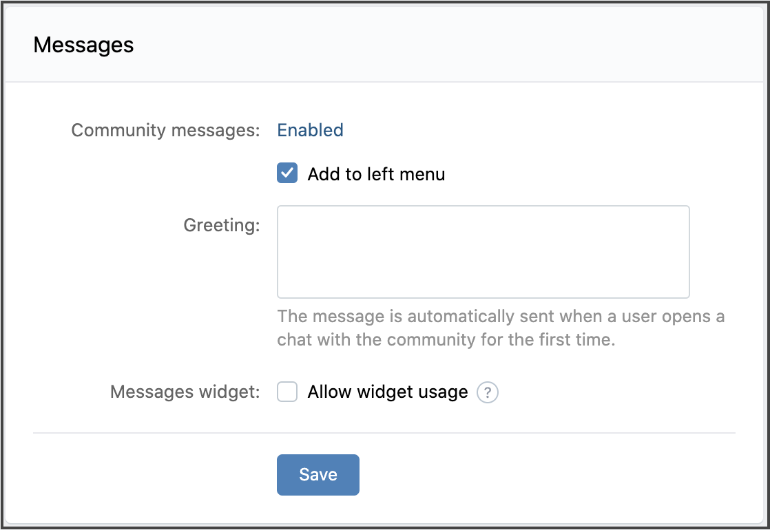 Go to your VK community. Go to Manage → Settings → Messages → Enabled. And click Save.