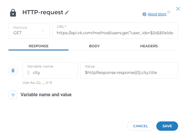 From the Conditions block, make a connection with an HTTP request to get the user’s city from the information about the VK page.
