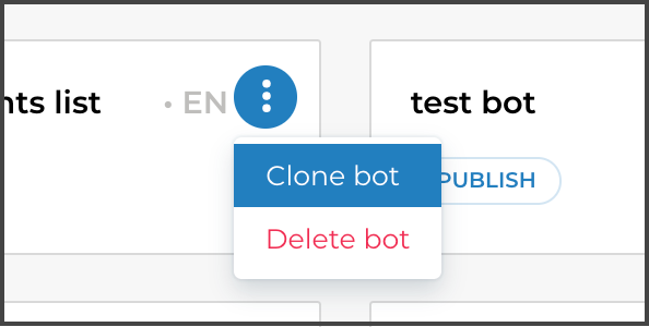 To copy your bot, go to your bot list and click Clone bot in the dropdown menu of your script: