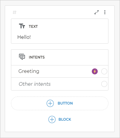 Now, the bot has to accept the client’s greeting. On the same screen, click + Block → More blocks → Greeting. The Greeting intent will be added to the screen.