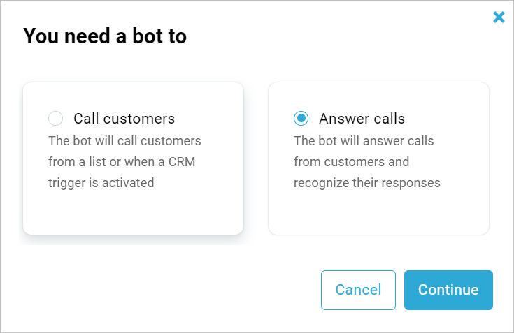 Go to Calls → Create a bot → Answer calls → Continue.