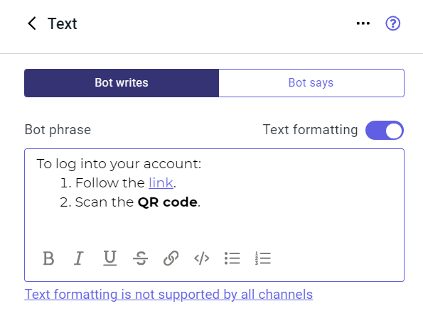 On the Bot writes tab, you can format bot text replies using HTML markup. It is supported only by the chat widget, Chat API, and Telegram. In other channels, the user will receive a message without any formatting.