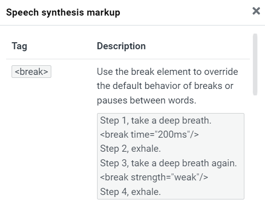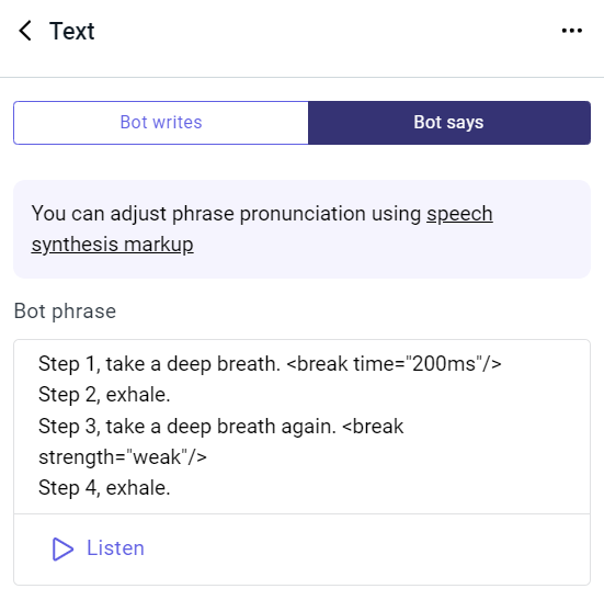 In the Speech synthesis markup window, you can familiarize yourself with the available tags for markup and copy an example to the Bot says tab. You can test how the phrase sounds by selecting Listen on the tab with a phrase.