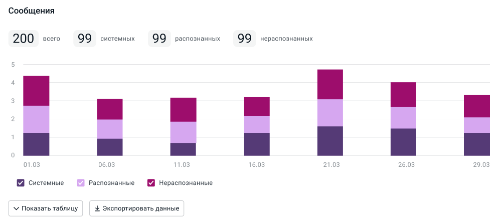 В разделе Сообщения отображаются только сообщения от пользователя, в том числе пустые запросы и сообщения с командой /start.