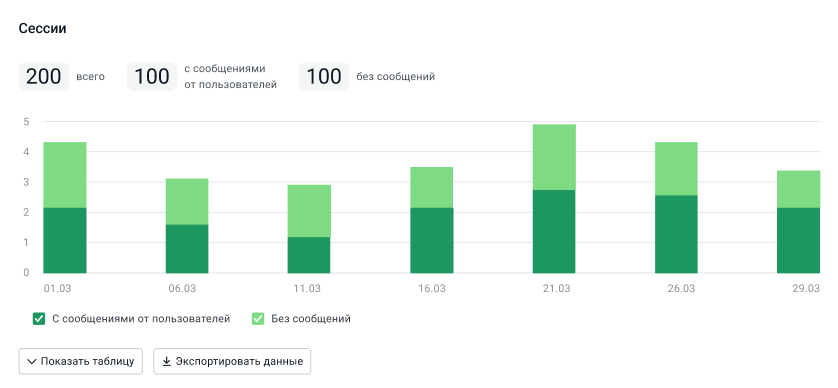 На вкладке Активность вам доступны количественные показатели: пользователи, сессии, сообщения.