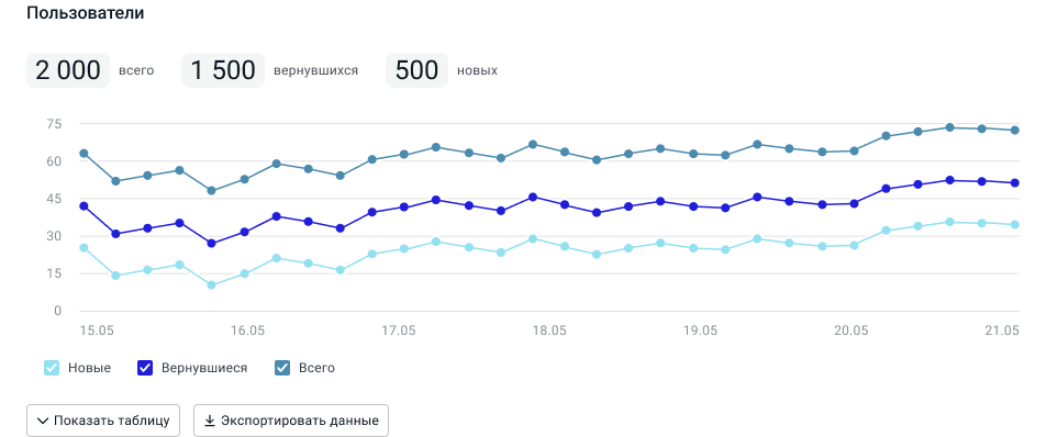 - Новые пользователи: в показателях и на графике пользователь считается новым только 1 раз.