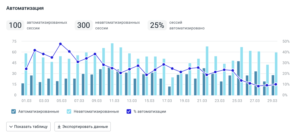 На графике отображается количество автоматизированных и неавтоматизированных сессий и их процентное соотношение.