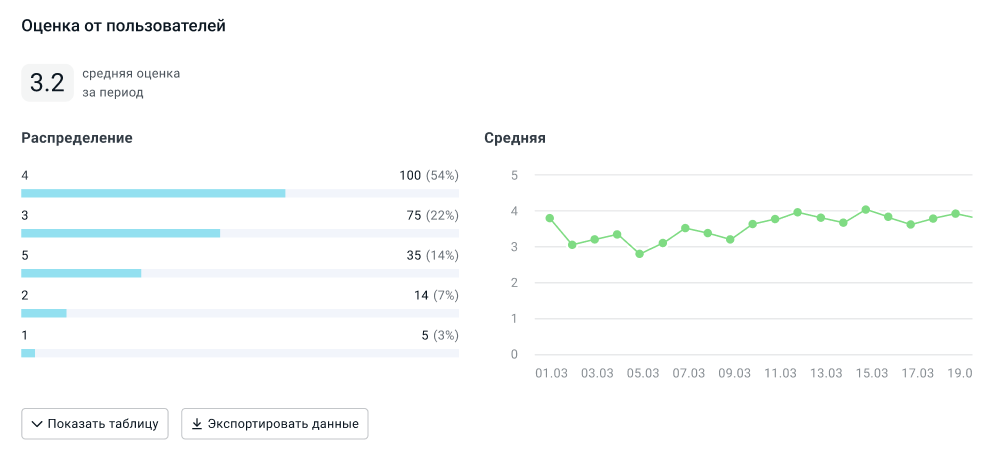 В разделе Оценка от пользователей отображается статистика по оценкам, которые пользователи ставят в диалоге.